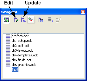 Open the master document. In the Navigator (Figure 349), select a subdocument and click the Edit icon (or right-click and choose Edit from the pop-up menu). The subdocument opens for editing.