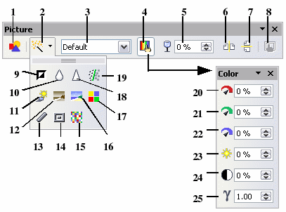 When you insert a new imageor select one already present in the document, the Picture toolbar appears. This toolbar can be either floating or docked. Figure 235 showswhat the Picture toolbar looks like when it is floating. Two other toolbars can be opened from this one: the Graphic Filter toolbar, which can be torn off and placed elsewhere on the window and the Color toolbar, which opens as a separate floating toolbar.