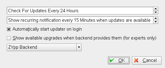 in Section 3.7.3, Configuring openSUSE Updater and tick the check box of