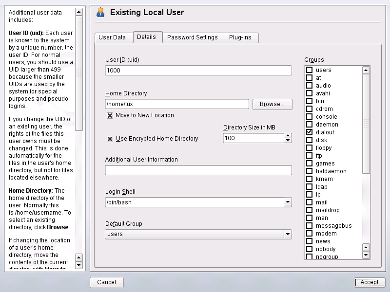 options, such as auto login, login without password, encrypted home directories or quotas for