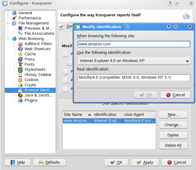 identity and make Konqueror identify as a different browser (for