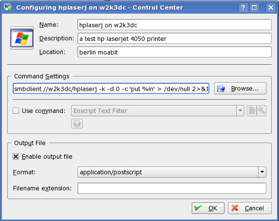 smbclient //domain/printer -k -d 0 -c 'put %in' > /dev/null 2>&1