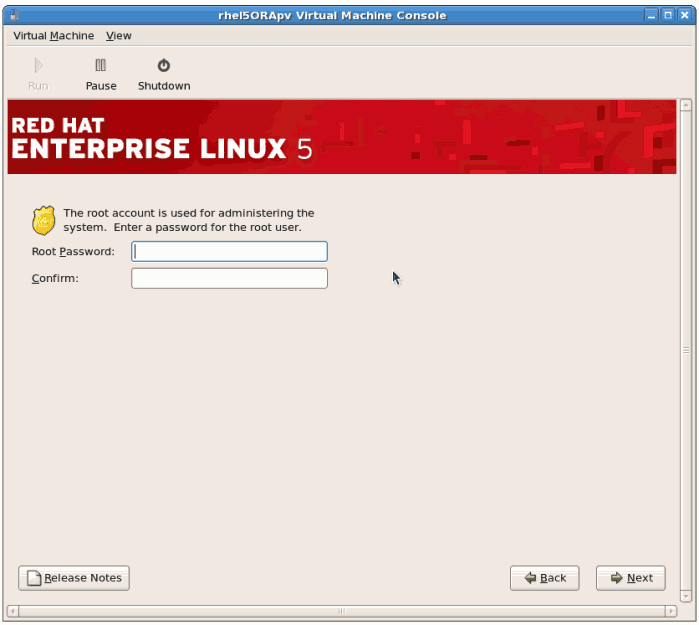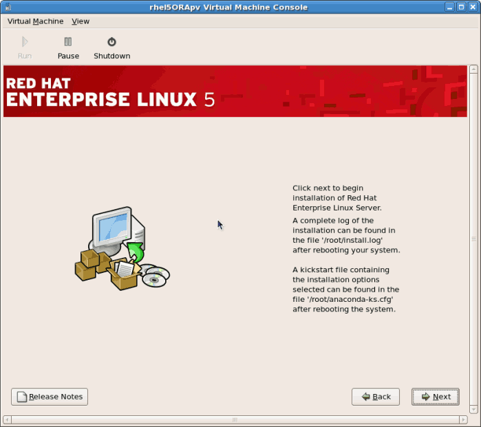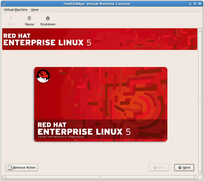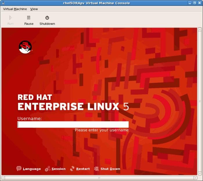 The Red Hat Enterprise Linux 5 login screen displays. Log in using the username created in the previous steps.