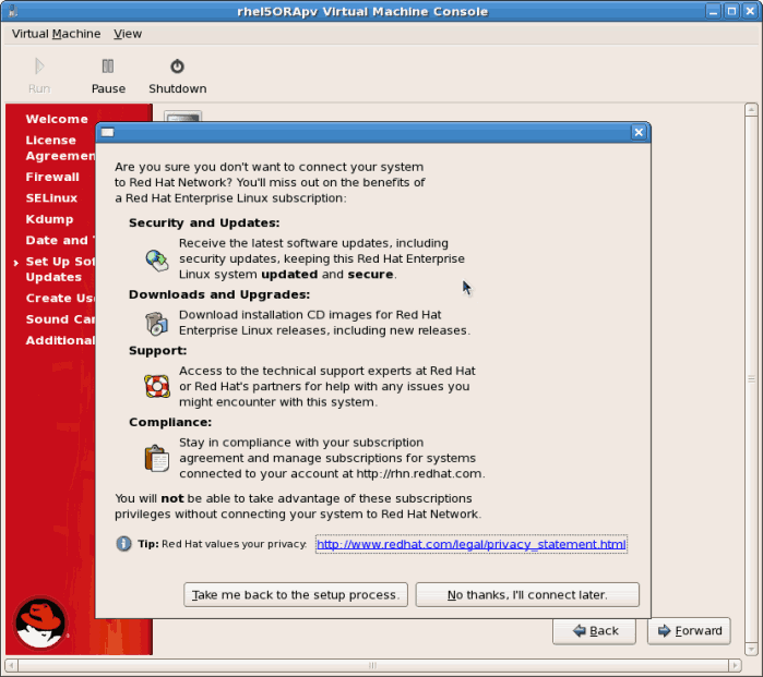 Set up software updates. If you have a Red Hat Network subscription or want to trial one use the screen below to register your newly installed guest in RHN.