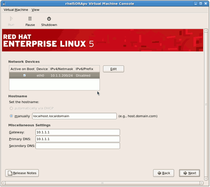 Configure networking and hostname settings. These settings are populated with the data entered earlier in the installation process. Change these settings if necessary.