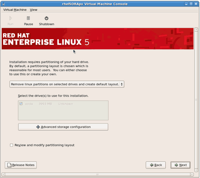 Review the storage configuration and partition layout. You can chose to select the advanced storage configuration if you want to use iSCSI for the guest's storage.