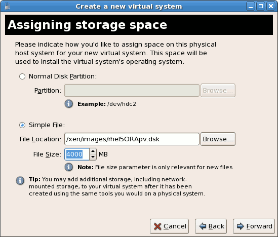 It is recommend that you use the default directory for virtual machine images, /var/lib/xen/images/. If you are using a different location (such as /xen/images/ in this example) make sure it is added to your SELinux policy and relabeled before you continue with the installation (later in the document you will find information on how to modify your SELinux policy)