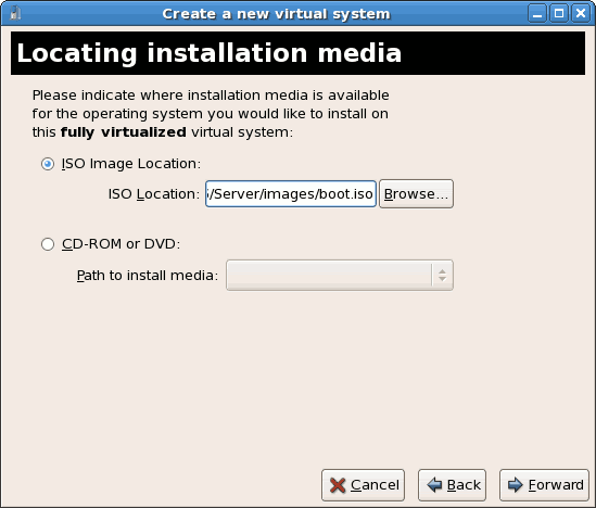 A fully virtualized guest installation require bootable installation DVDs, CD-ROMs or images of bootable installation DVDs or CD-ROMs(as .iso or .img files) locally. Windows installations use DVD, CD-ROM or .iso file. Many Linux and unix-like operating systems use an .iso file to install a base system before finishing the installation with a network based installation tree.