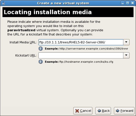 The para-virtualized installation requires an installation tree accessible using one of the following network protocols: HTTP, FTP or NFS. The installation media URL must contain a Red Hat Enterprise Linux installation tree. This tree is hosted using NFS, FTP or HTTP. The network services and files can be hosted using network services on the host or another mirror.