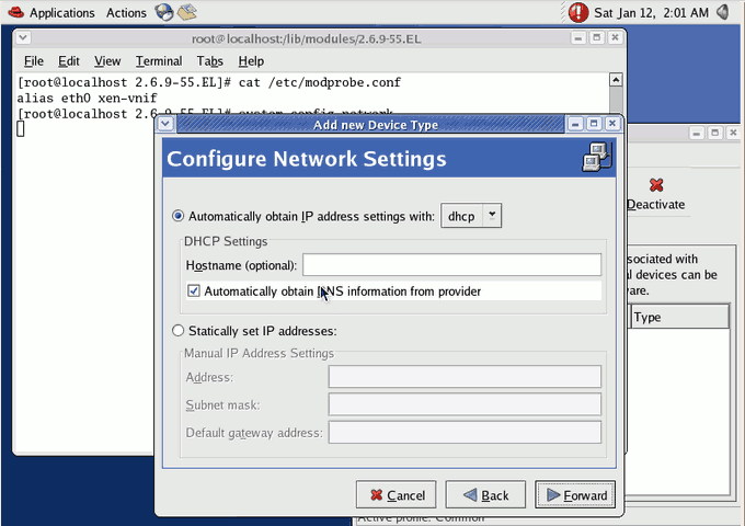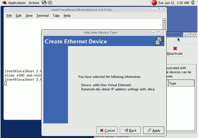 2. On Red Hat Enterprise Linux 4 verify the file /etc/modprobe.conf contains the line “alias eth0 xen-vnif”.