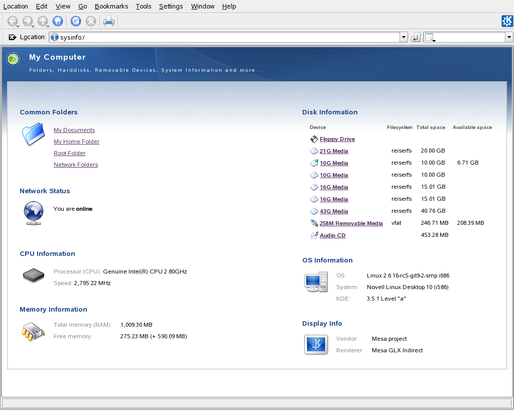 Displays information about hardware, network status,