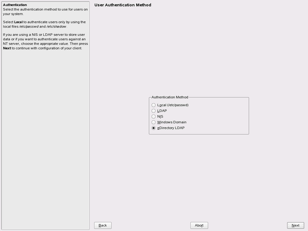 You can set up eDirectory Authentication during the SUSE Linux Enterprise Desktop installation, or you